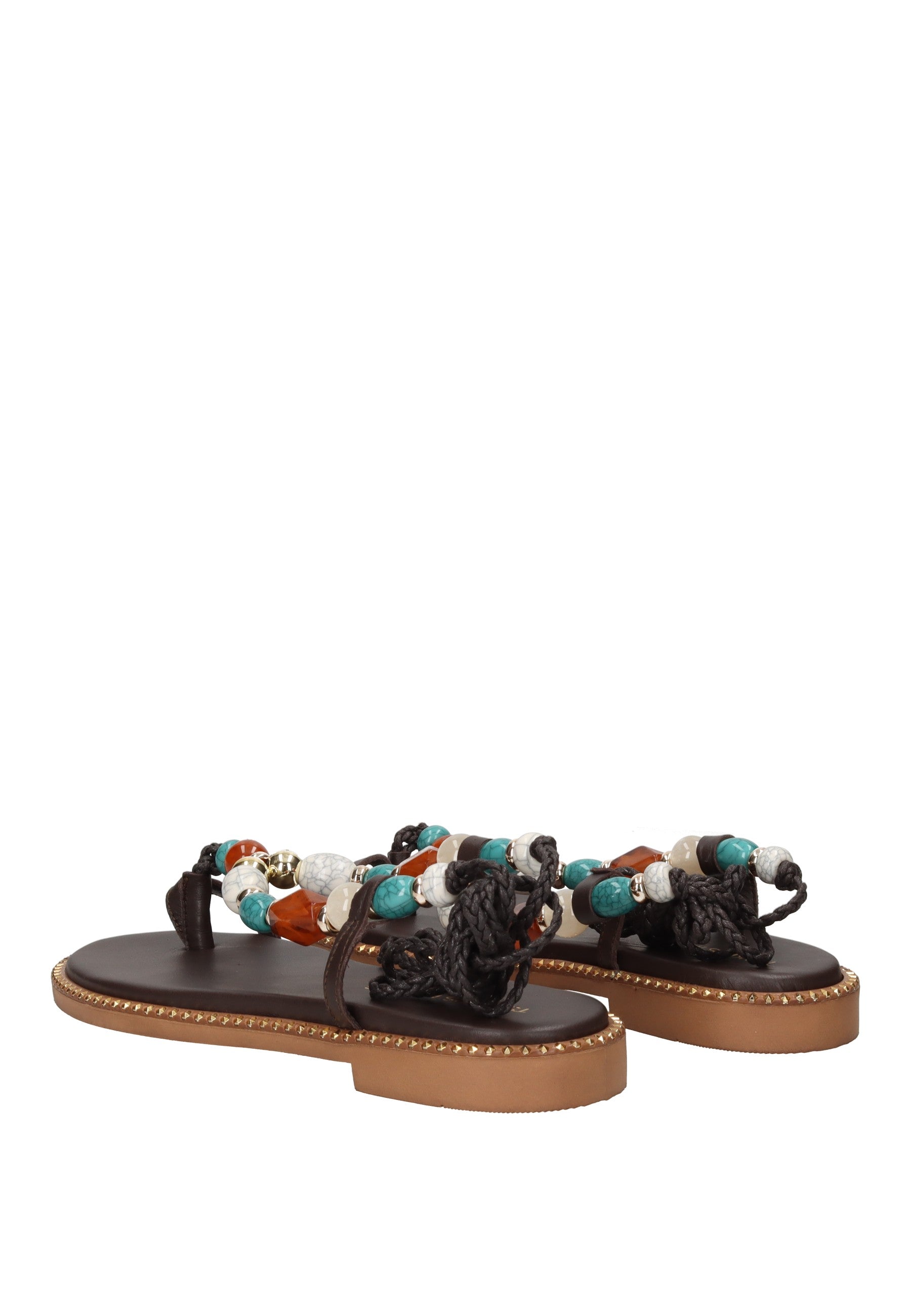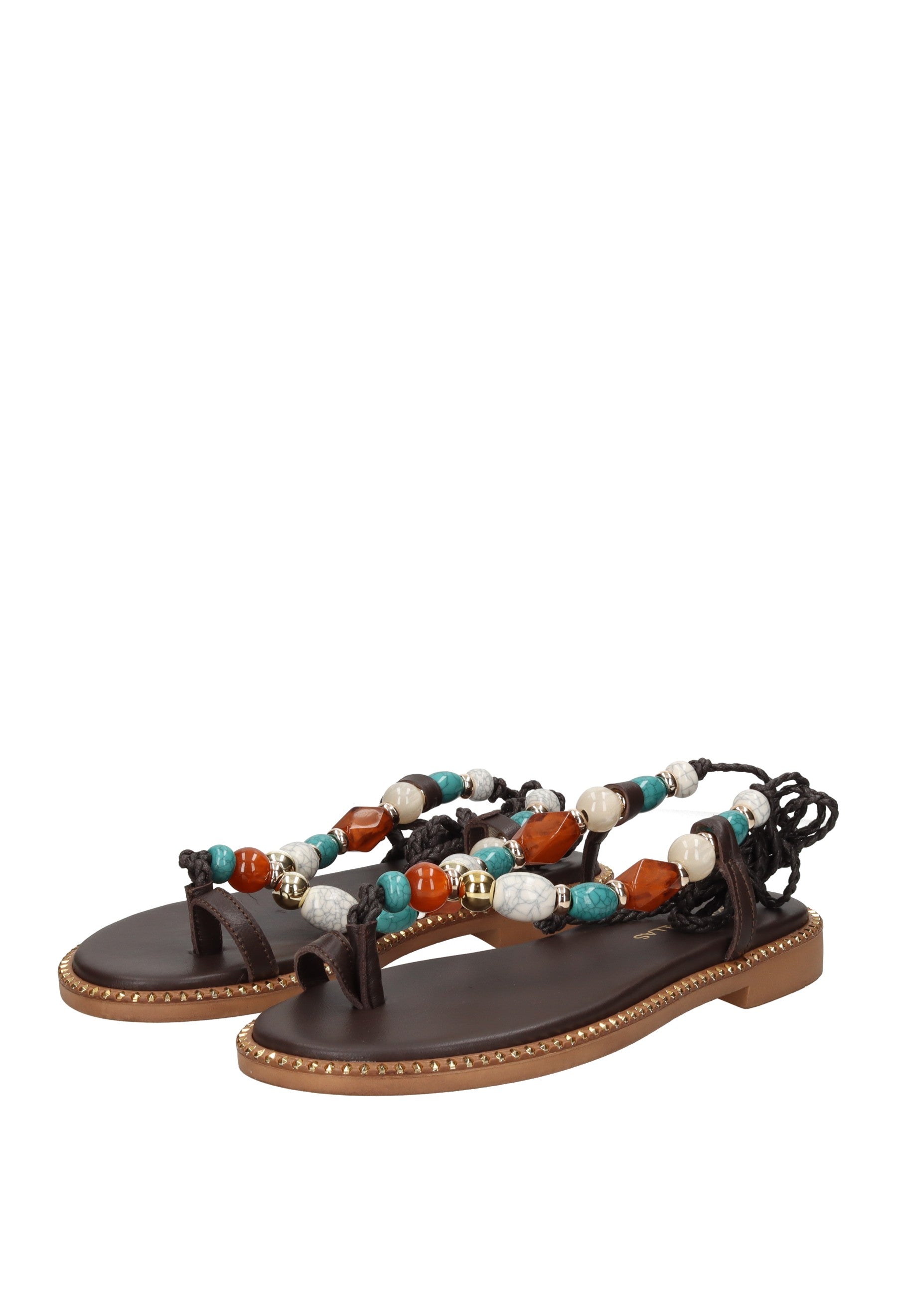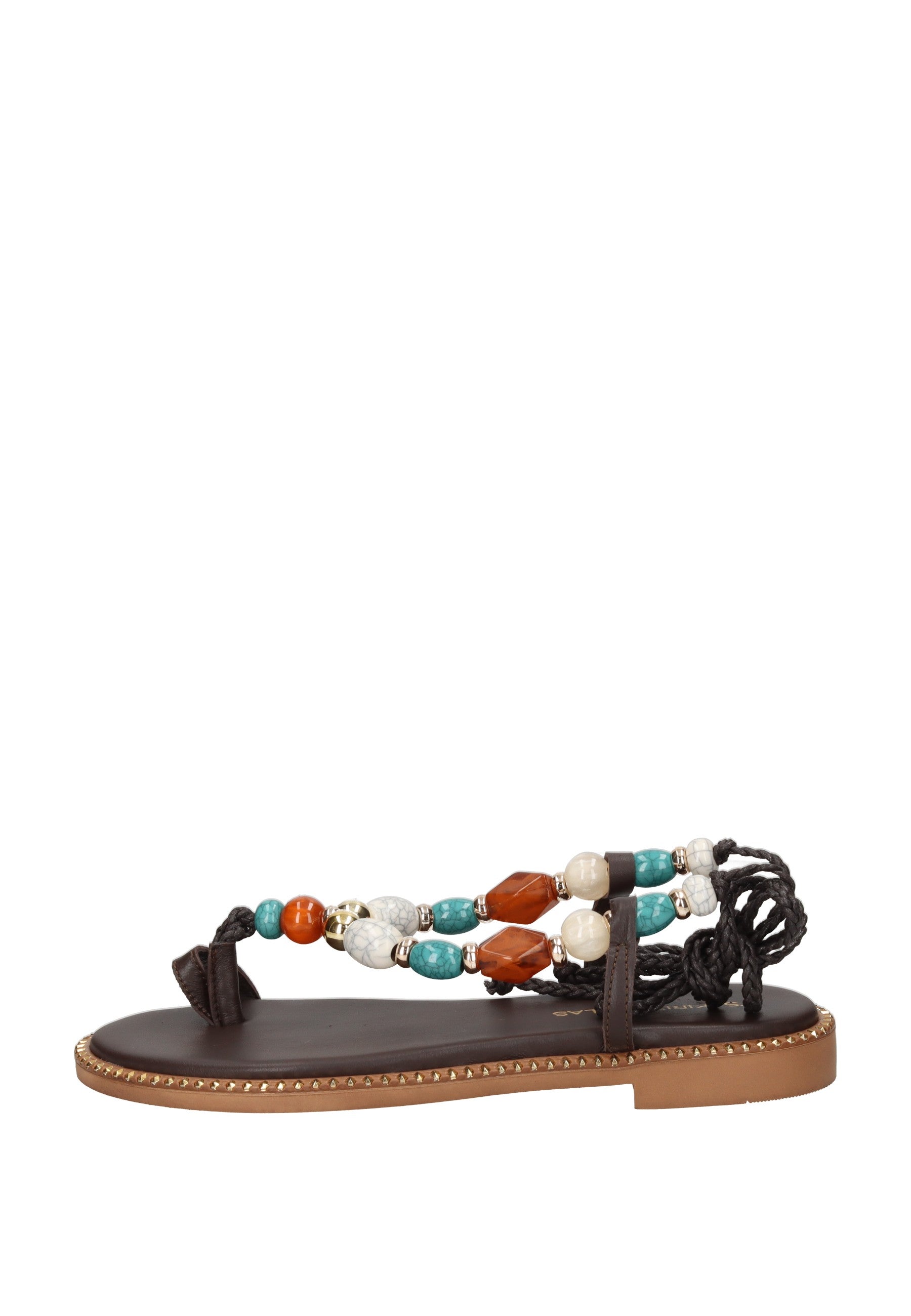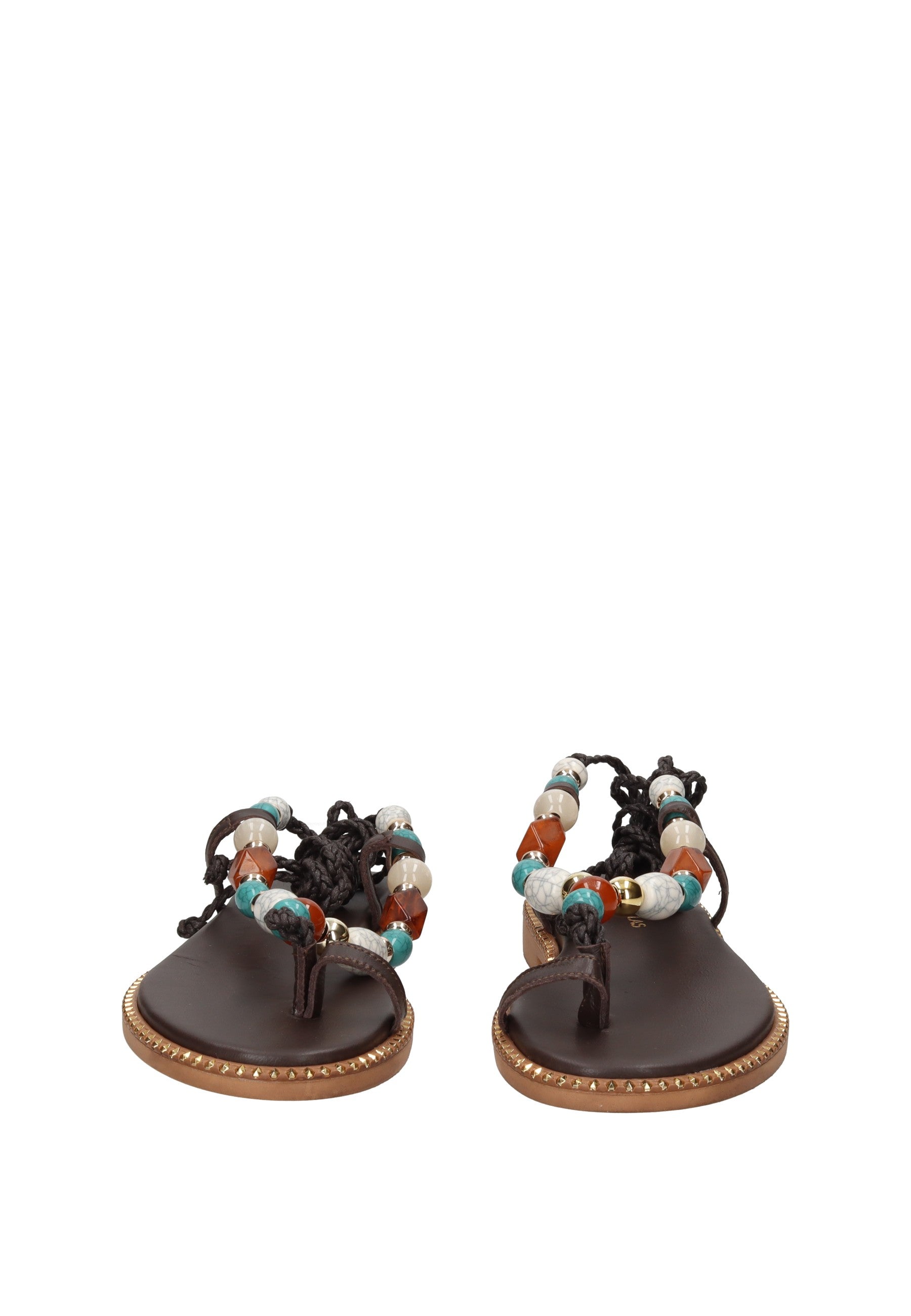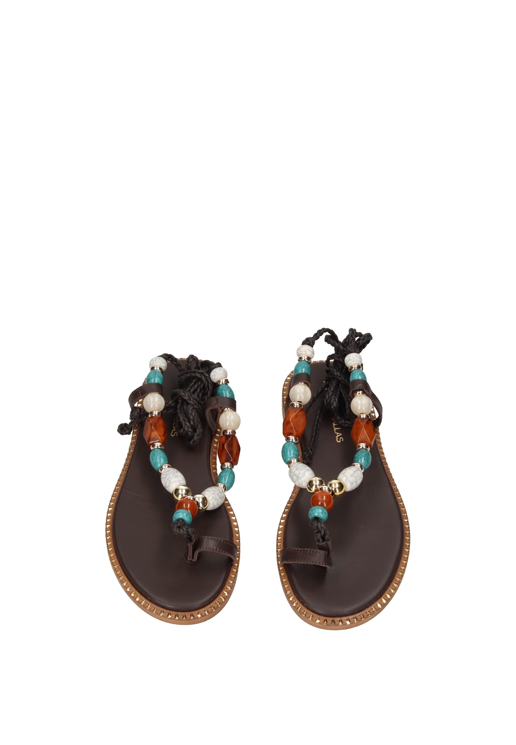 Sandalo infradito Vamos in pelle con chiusura a lacci alla schiava. Le fasce frontali sono impreziosite da pietre in applicazione che catturano la luce con eleganza. Il sottopiede imbottito in pelle garantisce comfort durante tutto il giorno, mentre il fondo in gomma con tacco di 2 cm offre stabilità e praticità. Un accessorio versatile che unisce stile e comodità per l'estate.